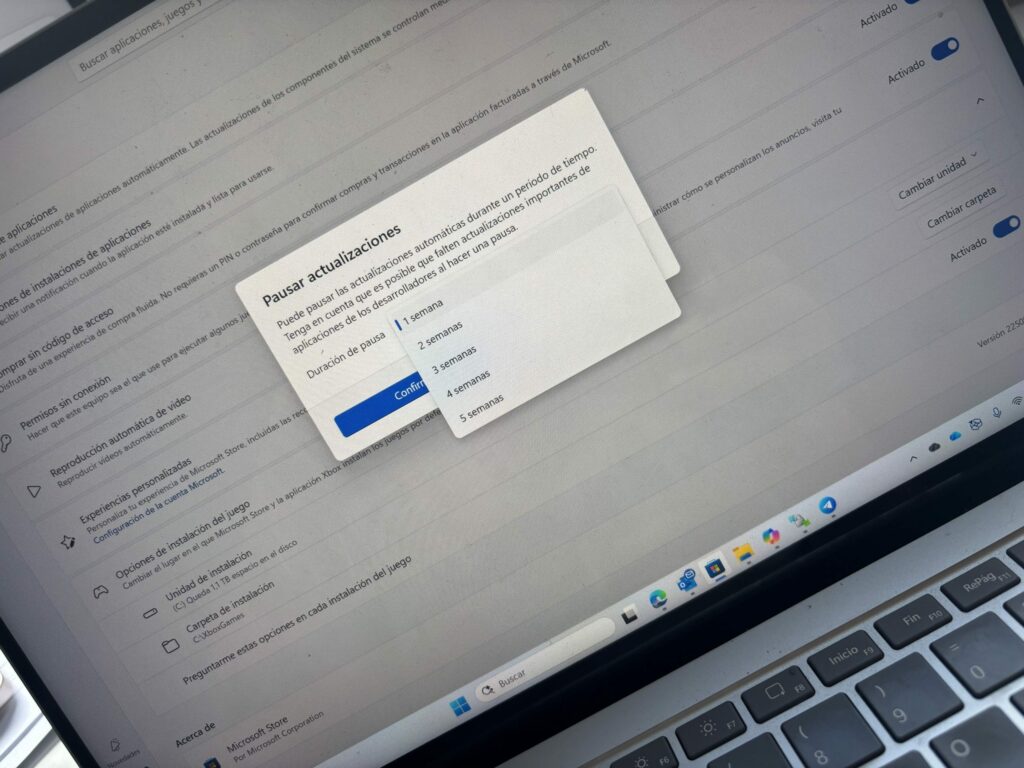 Anteriormente, se podía apagar las actualizaciones automáticas de la Store y gestionar manualmente las actualizaciones de tus aplicaciones. Ahora, al desactivar el interruptor, la Store te solicita seleccionar una duración de pausa (1–5 semanas). Una vez finalizado ese período, se reanudan las actualizaciones.